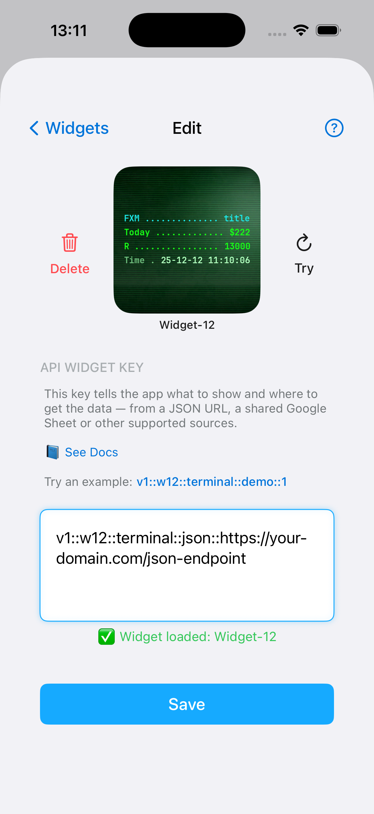 One simple key controls the widget type, theme, and where the data comes from.