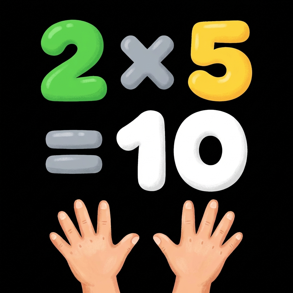 Each example is accompanied by an illustration that doesn't just attract attention but carries a meaningful connection to the result. For example: 2×5=10 — two hands (5 fingers each), 2×6=12 and 3×4=12 — a clock face with hands on the multipliers. These images create semantic "anchors" in memory.